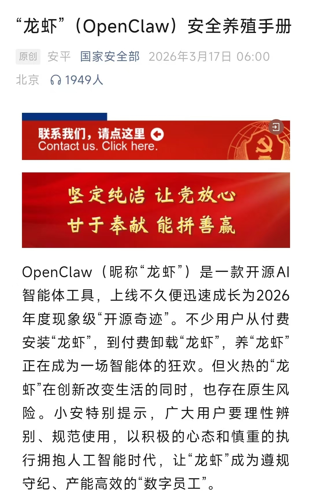 日前,微信公众号“国家安全部”对外发布“龙虾”(OpenClaw)安全养殖手册,这也让最近火爆的“龙虾”在安全防范方面有了更加权威的指引。该手册指出,“养虾人”不仅要给自己的“龙虾”全面体检和做好防护,还要让自己的“龙虾”老实好用。